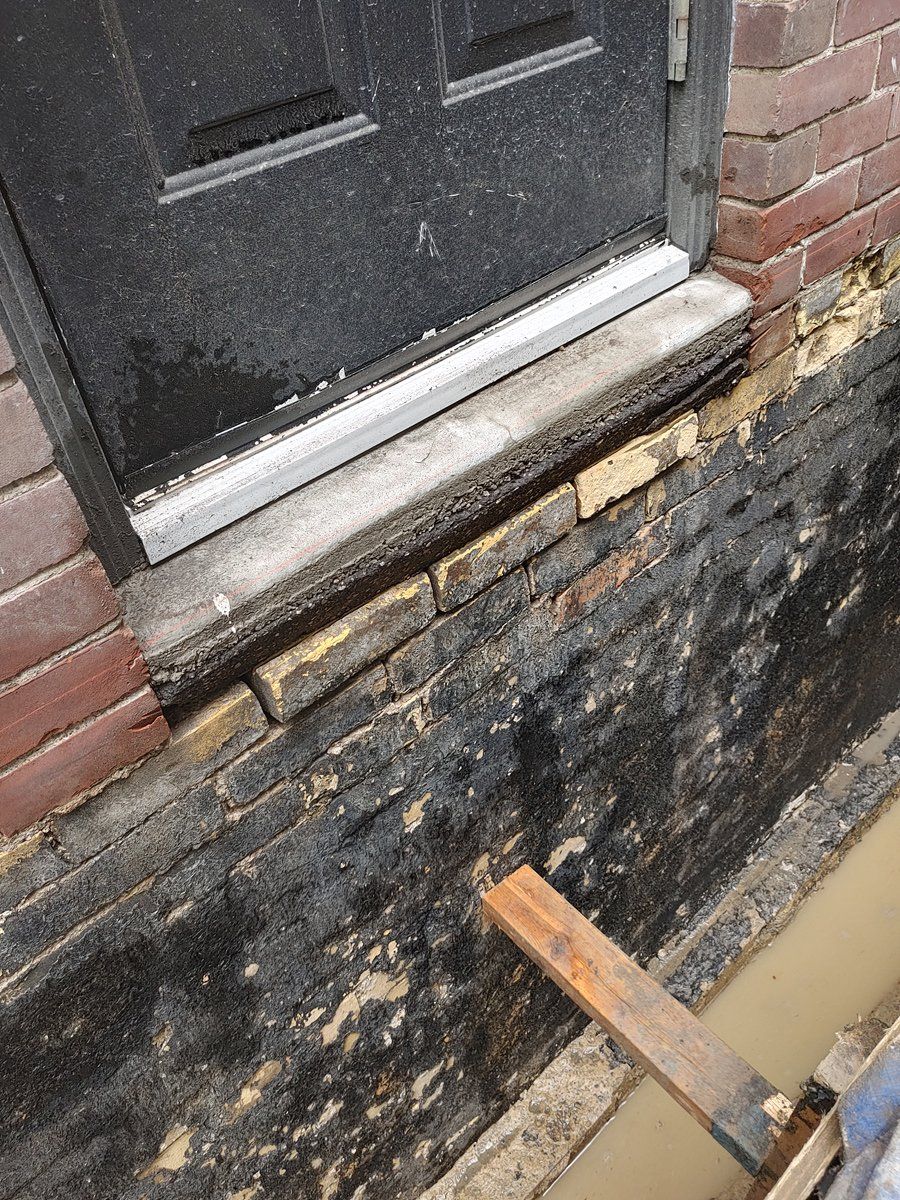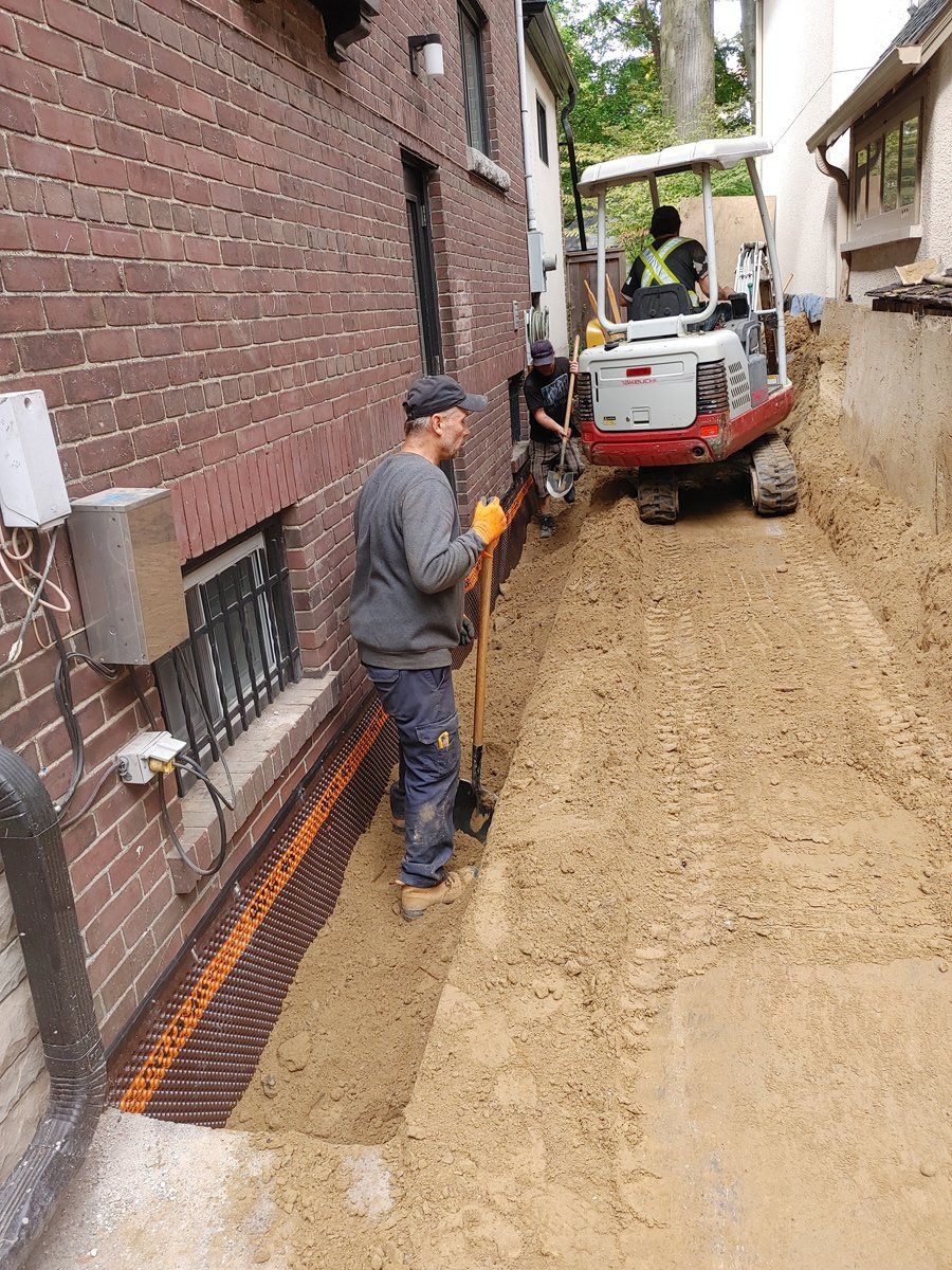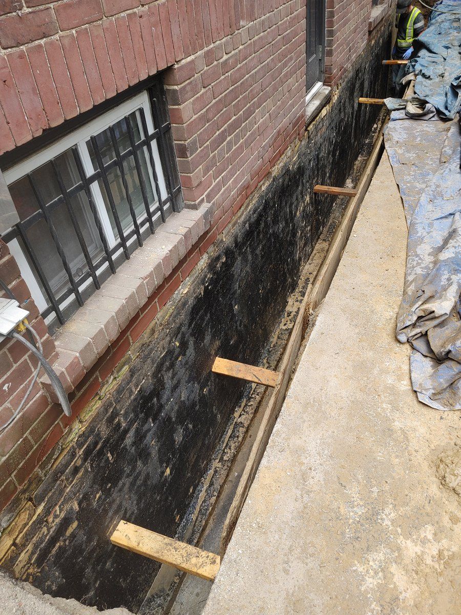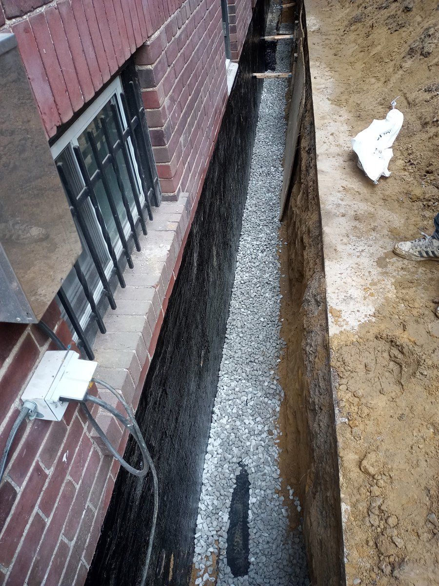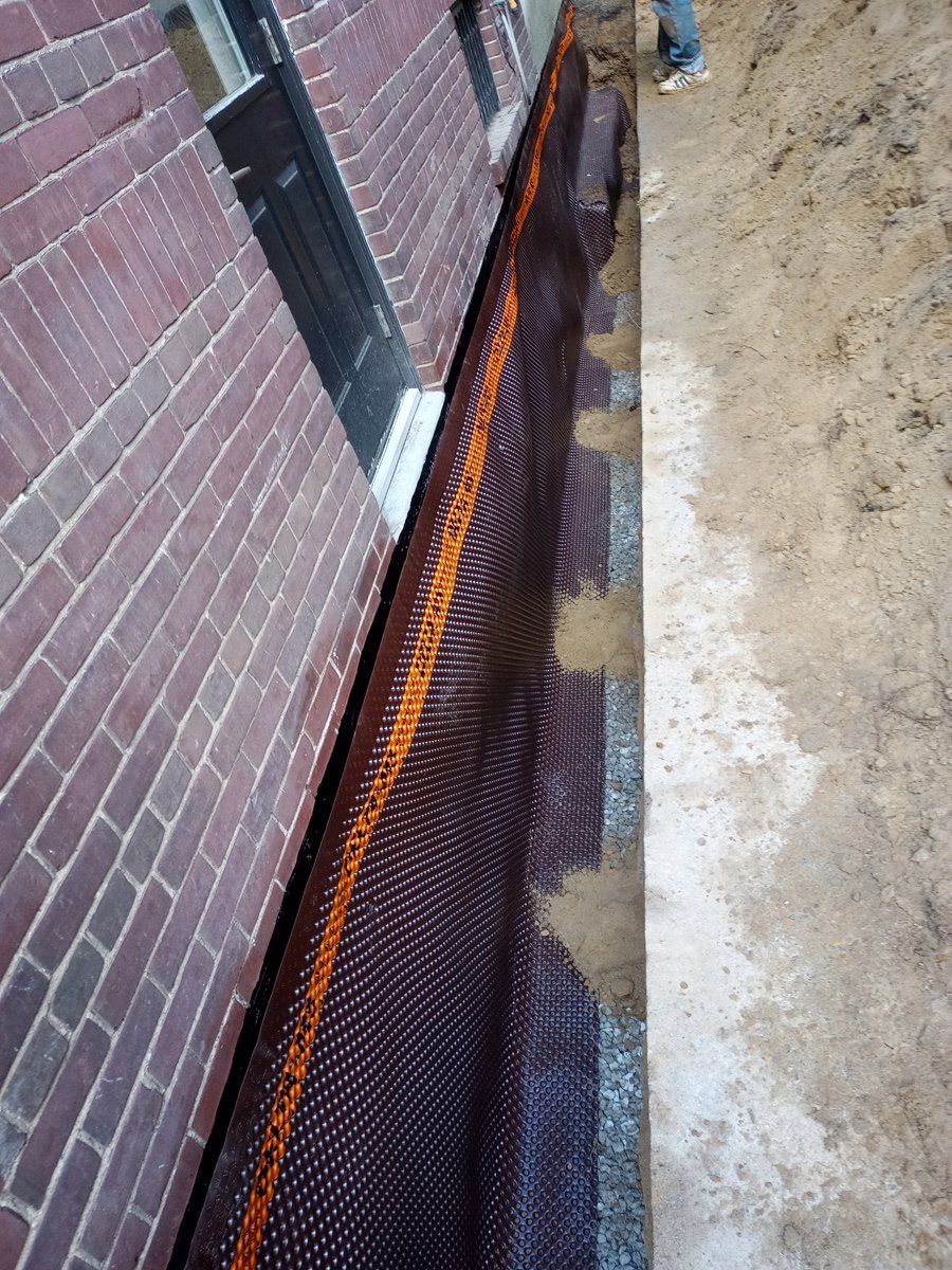 Pictured is a 100 year old brick foundation, The mortar holding the bricks together has eroded over time allowing water and moisture to penetrate the basement. Mold and mildew create an unsafe environment. After concrete repair to the wall and a rubber membrane applied, new weeping drainage pipe is installed at the footing. A dimple board is then installed and terminated a grade level. All good for another century.